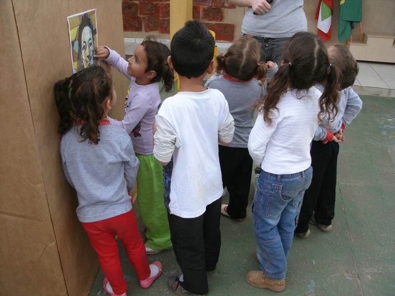 A exposição foi montada com um biombo em frente ao portão do CEI, para que as famílias também pudessem apreciar as obras.